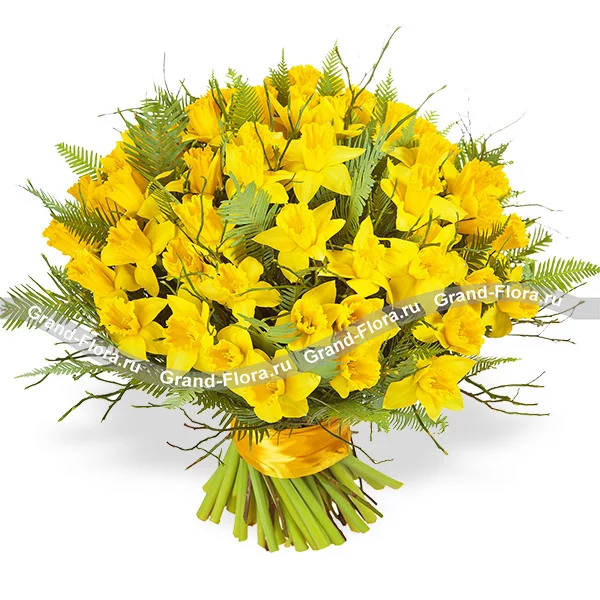 Стандартный: нарциссы - 51 шт., декоративная зелень, лента желтая.